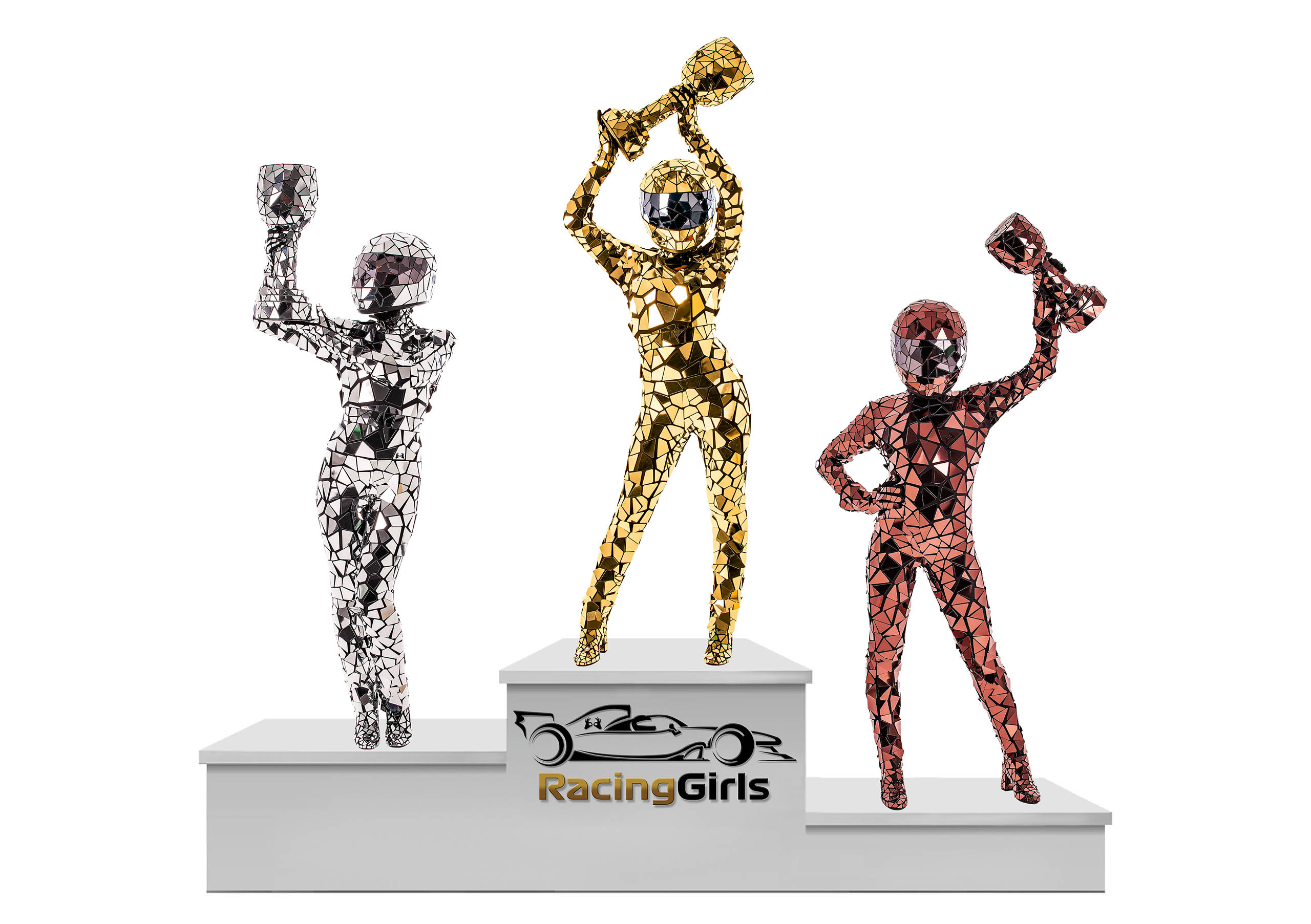 Costumes: Mirrored racer girls with trophies, made of gold, silver, and bronze polygons. They are perfectly matching all motorsports events.