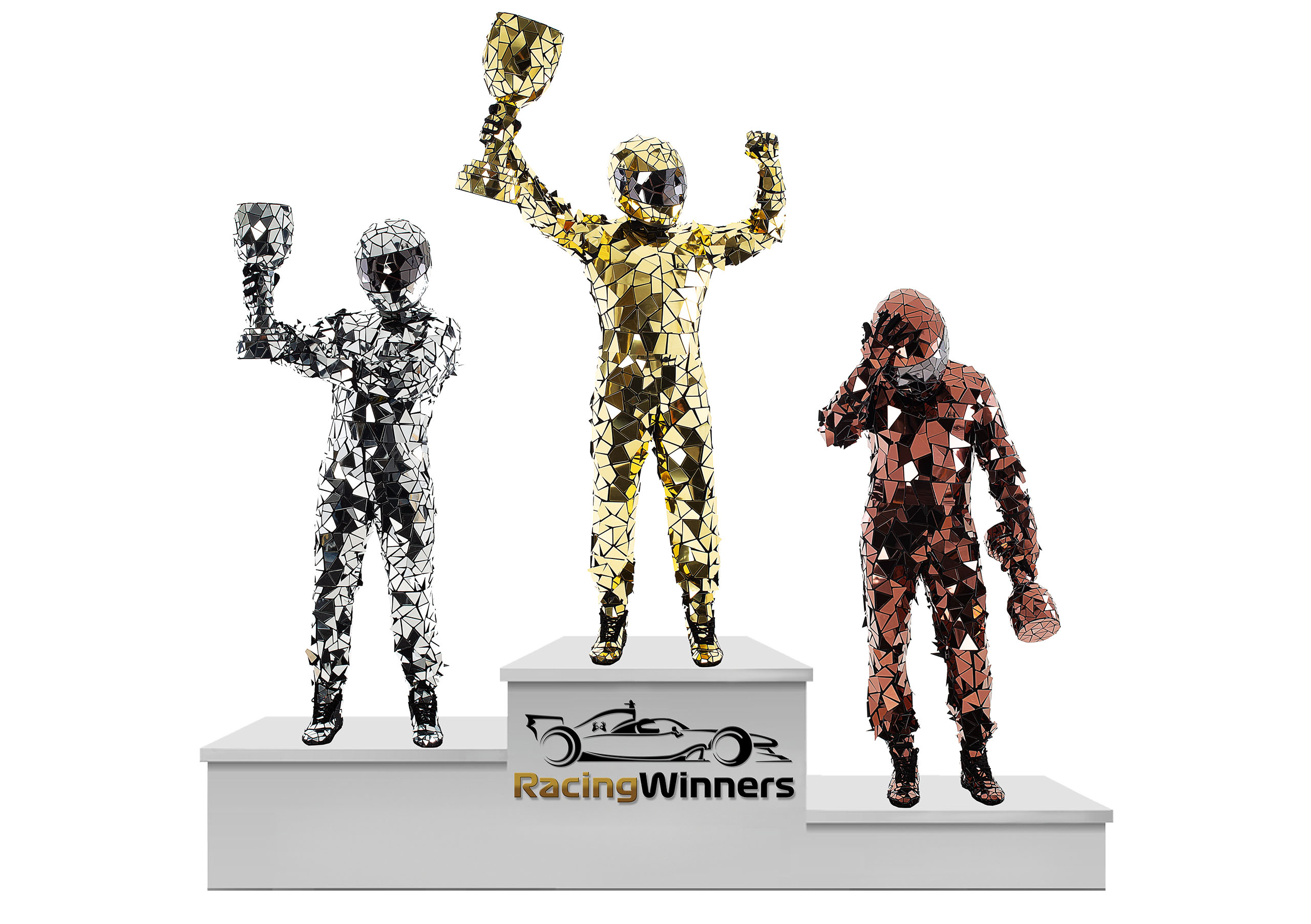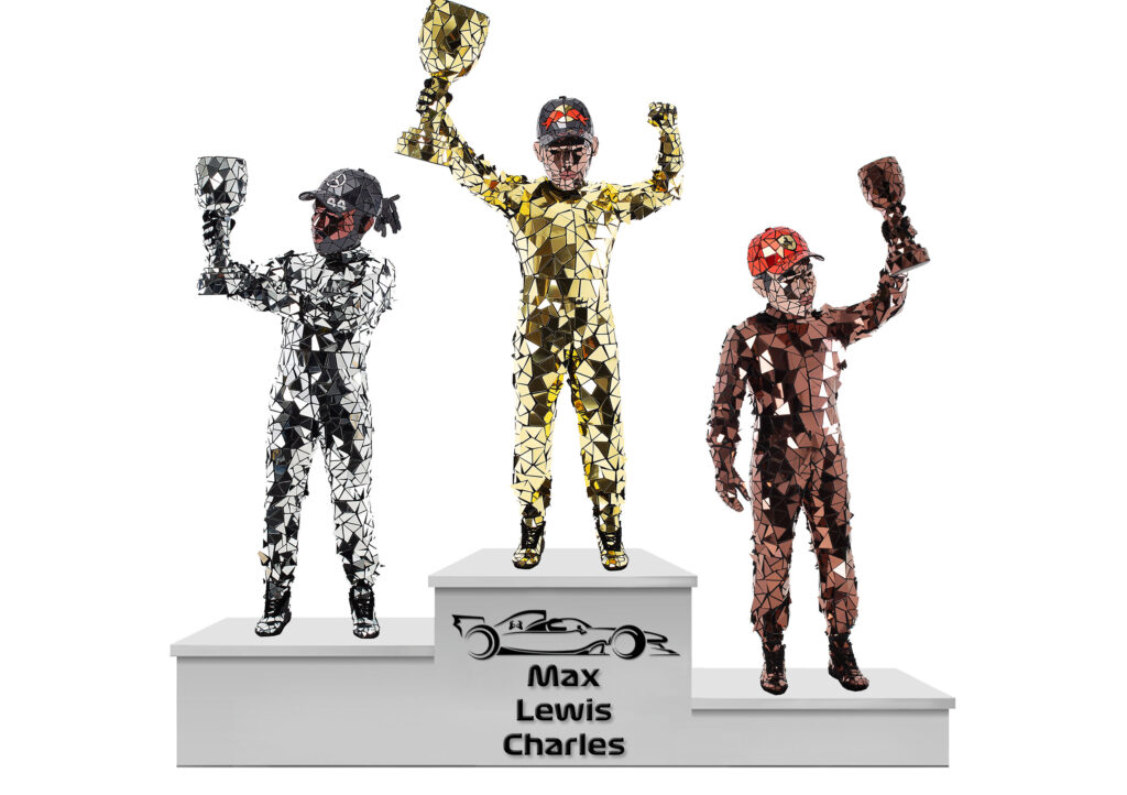 Costumes: Max, Lewis, Charles, mirrored racers with trophies, made of gold, silver and bronze polygons. They are perfectly matching all motorsports events.